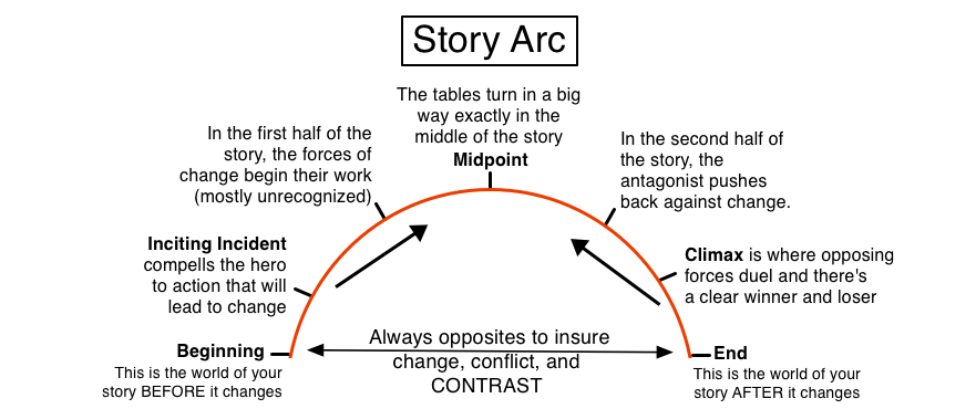 Below is a diagram illustrating a stories arc (whether novel, novella, or short story), as well as a more detailed article on this topic.